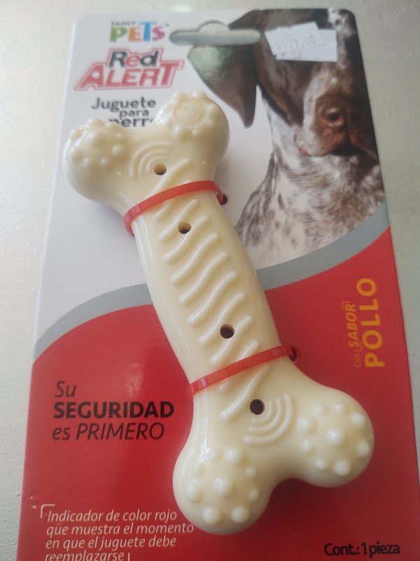 juguete para perro red alert en forma de hueso con sabor a pollo , con indicador de color rojo que muestra el momento en el cual el juguete debe ser reemplazado